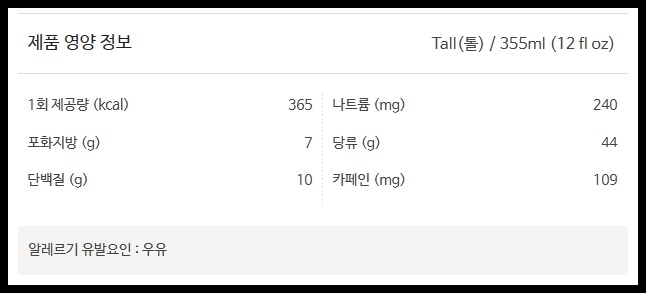 톨 사이즈로 카페인은 109mg가 들어있습니다. 우유를 포함하는 음료이기 때문에 단백질 10g과 포화지방 7g이 들어있고, 돌체시럽이 들어가서 당류가 44g 들어있습니다. 당류 때문인지 칼로리가 365kcal로 높은 편입니다. 당류를 줄이고 싶다면 주문 시 퍼스널옵션에서 시럽 양을 줄이면 되겠습니다.